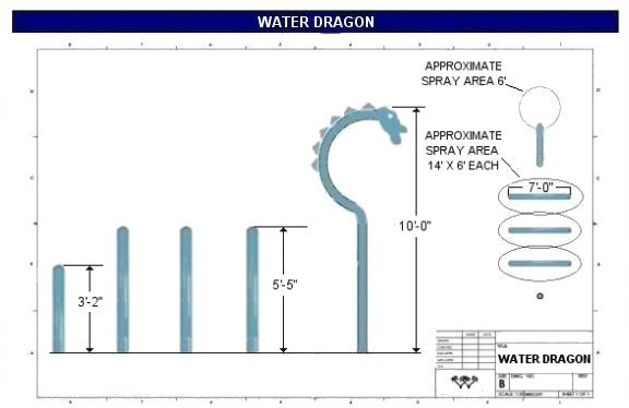 Water Dragon 4 1/2″ OD 304 Stainless Steel Dragon head, 3 Water Rings and an Activation Post set in a line to form a Dragon Beautiful protective powder coat finish in a wide array of colors Above Ground Features